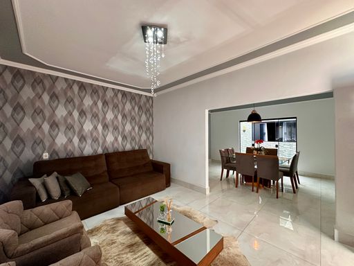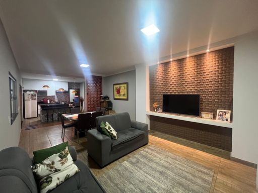 Casa a venda com 3 dormitórios, sendo 1 suite, sala tv com painel, sala de jantar com mesa e 6 cadeiras, cozinha planejada, cooktop, geladeira, forno, micro ondas, área gourmet.Luxuosa, aconchegante, requintada, espaçosa, toda no porcelanato, planejados, teto rebaixado, iluminação led, garagem 2 vagas, lavanderia coberta, rancho com churrasqueira.