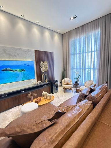 Casa Térrea contendo: 03 suítes, sendo 01 suíte máster com closet hidro, Home Theater, sala de estar, lavabo, sala de jantar, cozinha americana, despensa, lavanderia, garagem 02 carros, espaço gourmet completo com churrasqueira, W.C., Piscina com raia e hidro, sauna e jardim. Todos os ambientes com armários, ar-condicionado, papel de parede. Energia fotovoltaica, Fechadura Eletrônica, Portas em PVC, Elétrico domésticos. Ambiente externo piso em porcelanato e pedra. Ambiente interno piso porcelanato. Documentação OK. Opção do negócio ficar todos moveis.
