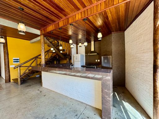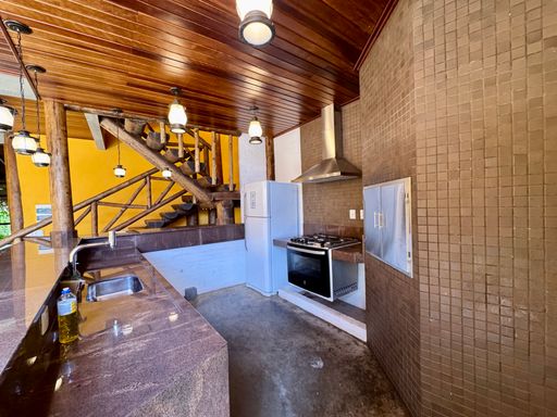 • Cozinha americana integrada, com churrasqueira, fogão com coifa e pia em granito