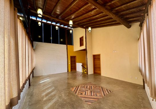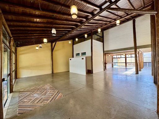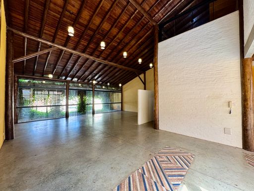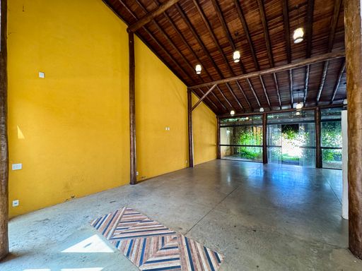 • Paredes em tijolos rústicos e piso em concreto desempenado com mosaico.