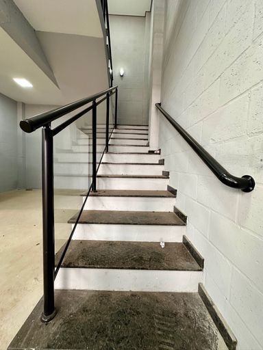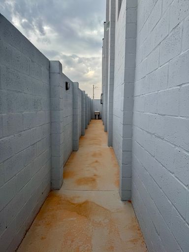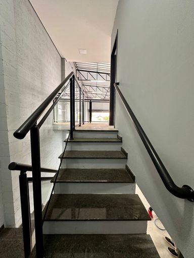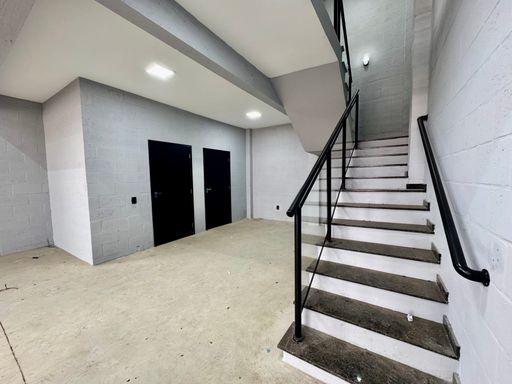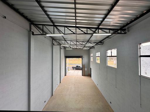 Entrada para caminho Portão automático com 5 metros de altura, entrada de serviço, ventilação natural, piso de concreto, piso porcelanato, estrutura metálica, com telha Galvanizada.