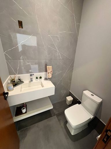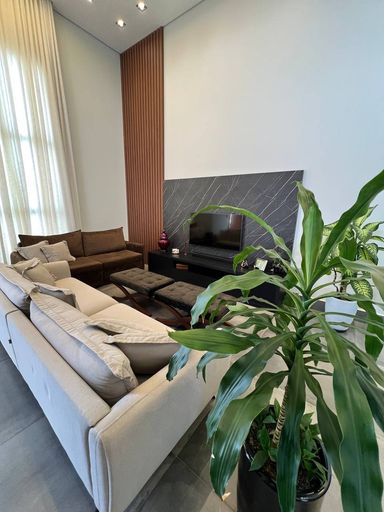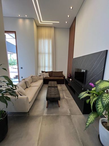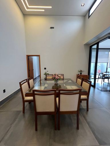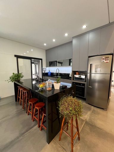 Ao todo essa casa contém 3 dormitórios sendo uma suíte master com closet e escritório, ambos os dormitórios tem móveis planejados de altíssima qualidade e requinte. Adentrando no imóvel temos um lavabo para atender todo o hall social, como: Sala de TV & Sala de Jantar para até 8 pessoas. Já na integração com a área gourmet com fechamento de vidro temos a cozinha americana conjugada com a lavanderia que também é planejada.