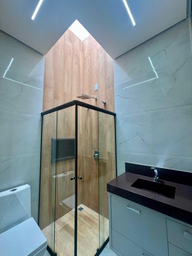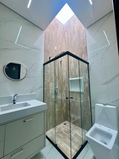 Acabamentos: Piso porcelanato e vinilico, teto rebaixado com gesso, pé direito duplo, esquadrias e portas em alumínio e aquecedor.