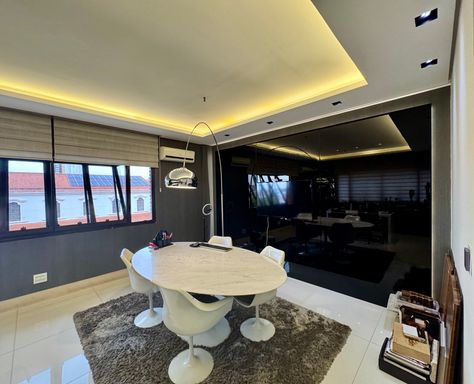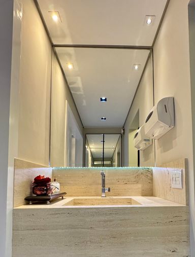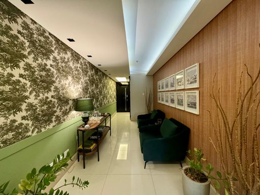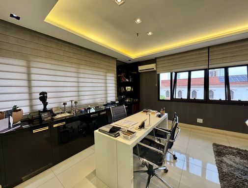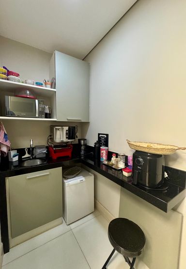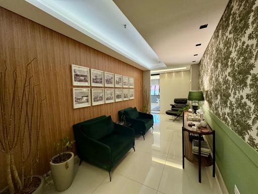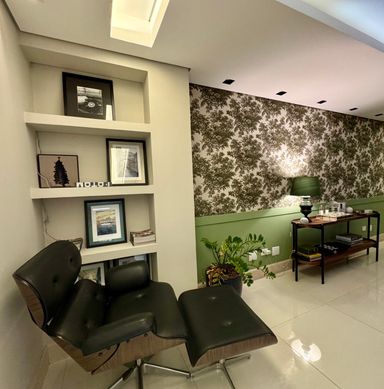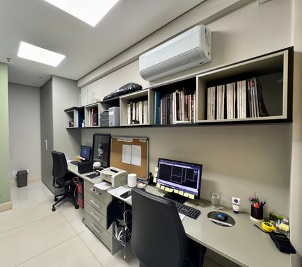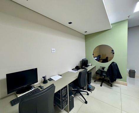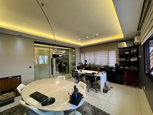 Sala comercial moderna e totalmente decorada, com hall de entrada, 02 banheiros (feminino e masculino), recepção com papel de parede teto rebaixado, ampla sala diretoria com sala de reunião integrada e vista panorâmica, sala de desenvolvimento de projetos para 04 pessoas, copa e 01 vaga de garagem.