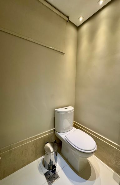 Ambientes com piso em porcelanato, teto em gesso rebaixado, sanca, persianas, pia em mármore e acabamento de alto padrão.
