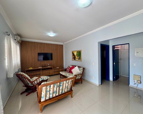 • Sala de TV mobiliada, com painel, TV, cortina, sofá e ar-condicionado