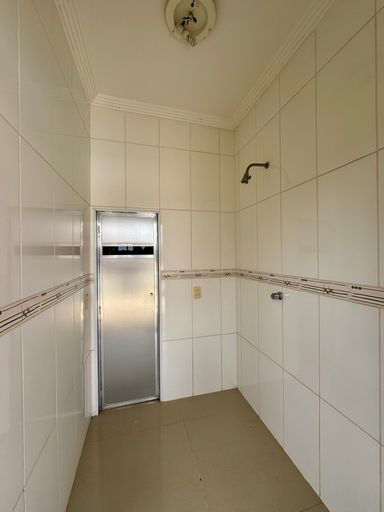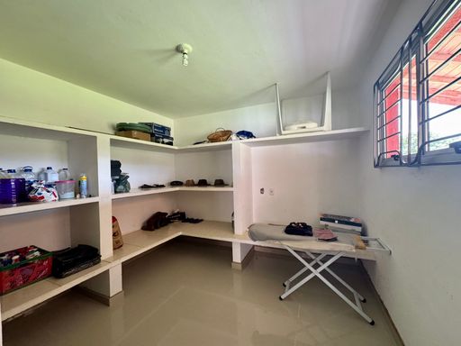 • Quarto de despejo com porcelanato, janelas de alumínio e prateleiras em concreto