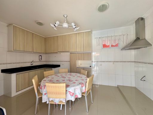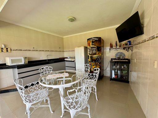 • Cozinha com armários, geladeira, cervejeira, mesa de ferro, TV e micro-ondas.