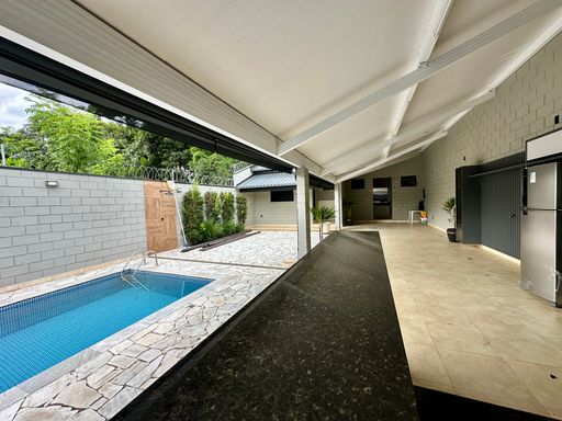 1 suite com planejado, cama casal nova, banheiros masculino e feminino com armários planejados novos, espelhos, piscina, ducha, salão com churrasqueira, fogão, geladeira nova, painel ripado com cristaleira, recém pintada, reformada inteira, pintura nova, moveis novos. Local muito tranquilo e seguro, documentação em ordem.